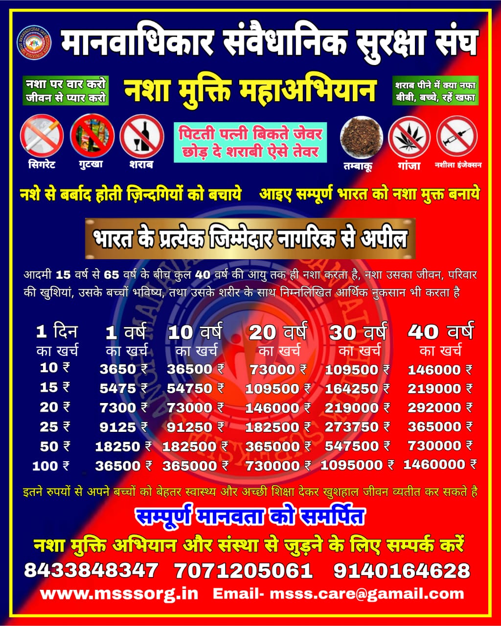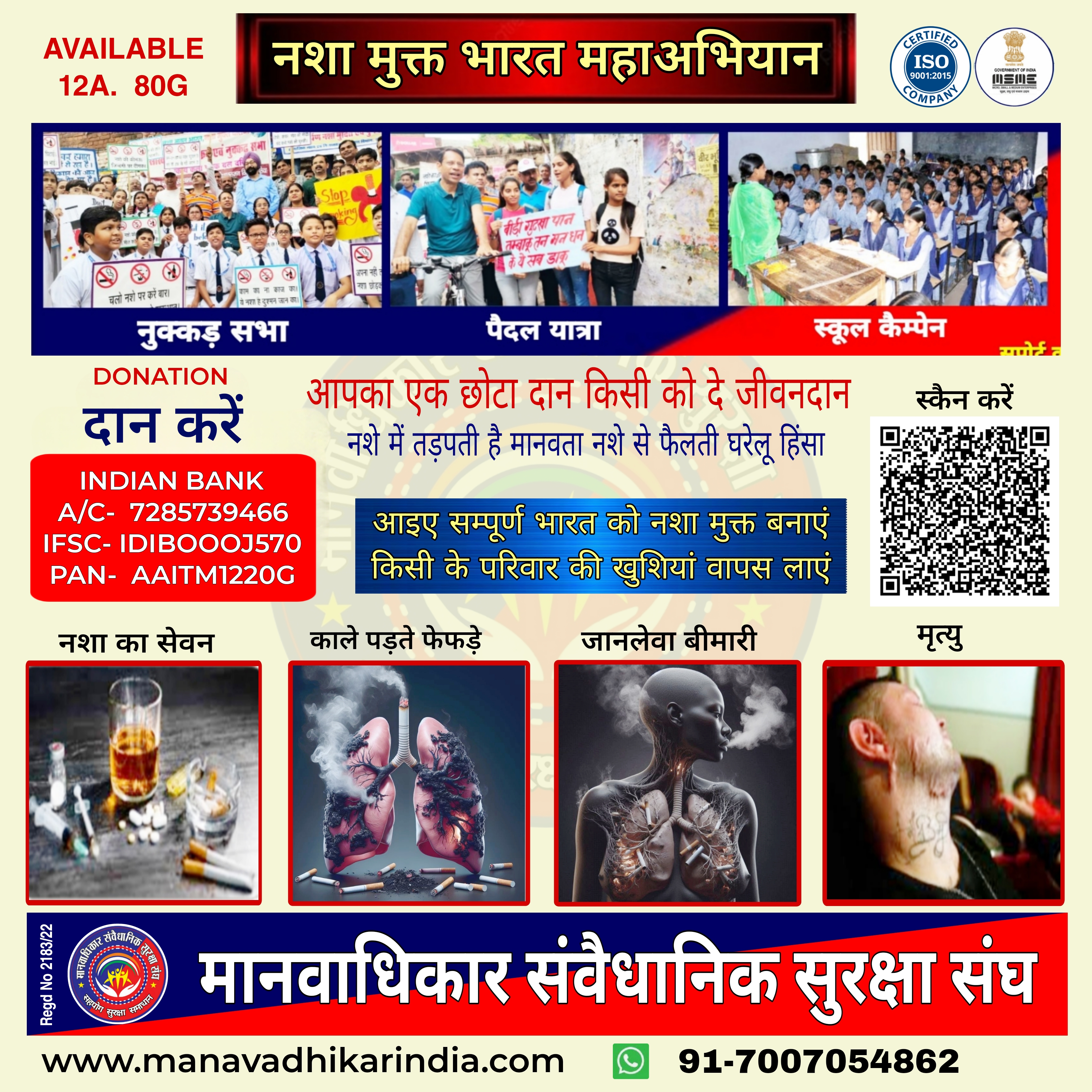 नशा आज समाज के लिए एक गंभीर समस्या बन चुका है, जो न केवल व्यक्ति को शारीरिक और मानसिक रूप से प्रभावित करता है, बल्कि परिवार और समाज को भी बर्बाद करता है। मानवाधिकार संवैधानिक सुरक्षा संघ का "नशा मुक्त भारत कार्यक्रम" इसी उद्देश्य के साथ शुरू किया गया है कि देश को नशा मुक्त बनाया जा सके और स्वस्थ, सशक्त समाज का निर्माण किया जा सके। कार्यक्रम के उद्देश्य: जागरूकता फैलाना: नशे के दुष्प्रभावों के बारे में समाज में जागरूकता फैलाना। नशा मुक्ति सहायता: नशा करने वालों को इससे छुटकारा दिलाने में सहायता करना। कानूनी संरक्षण: नशे के व्यापार और उपयोग पर कानूनी रोकथाम को बढ़ावा देना। पुनर्वास केंद्रों का समर्थन: नशा मुक्त केंद्रों और पुनर्वास सेवाओं को सहयोग प्रदान करना। युवाओं को दिशा देना: युवाओं को नशे से बचाने के लिए सही मार्गदर्शन और सकारात्मक गतिविधियों में संलग्न करना।