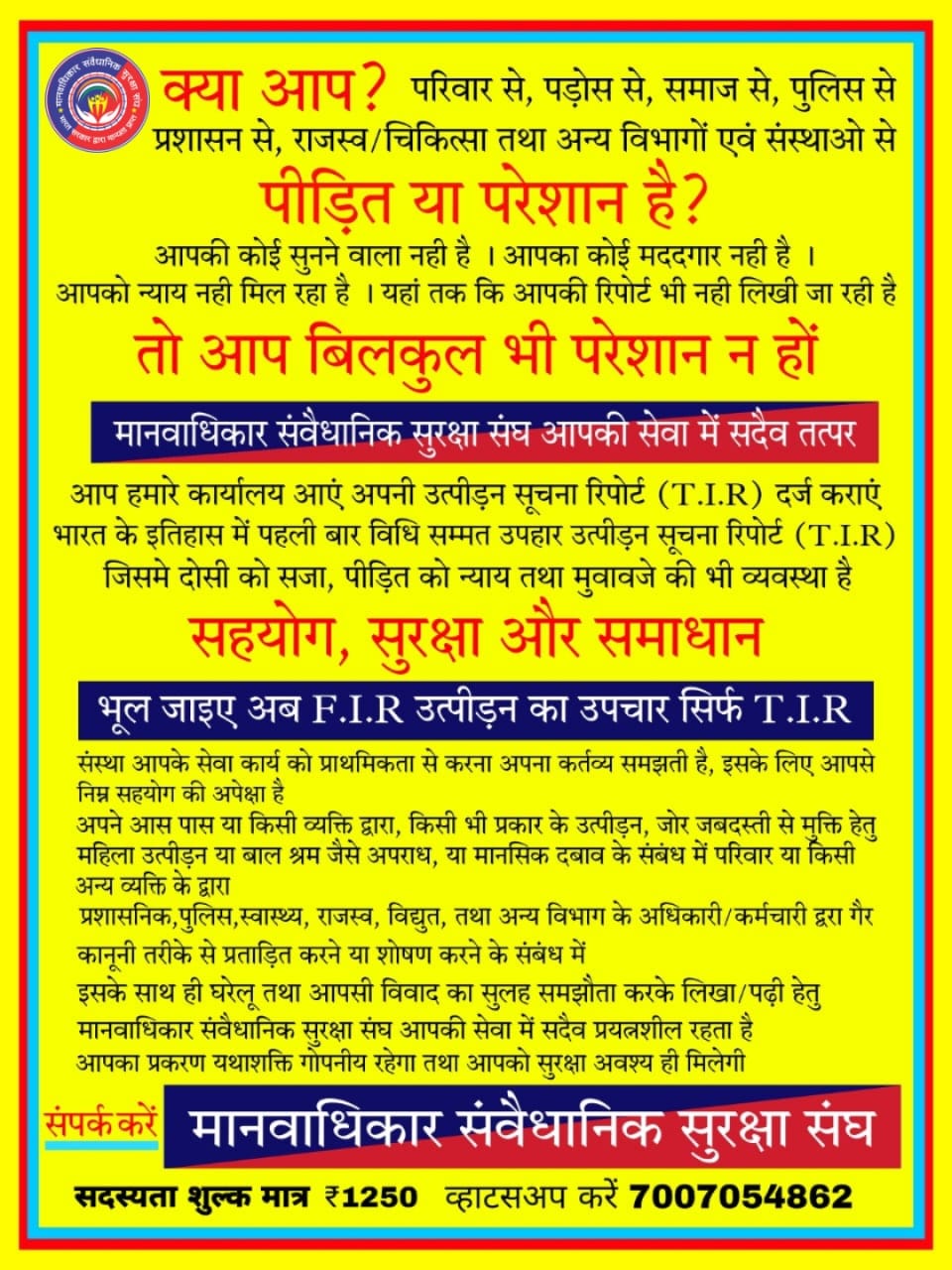 सशक्त महिला, सशक्त भारत" कार्यक्रम का उद्देश्य महिलाओं को उनकी शक्ति और अधिकारों का एहसास दिलाना है, ताकि वे समाज में समान रूप से योगदान कर सकें। यह कार्यक्रम महिलाओं को आत्मनिर्भर, सशक्त और सक्षम बनाने की दिशा में काम करता है। इसके अंतर्गत महिलाओं के लिए विभिन्न पहलुओं पर जागरूकता, शिक्षा, कौशल विकास, और कानूनी सहायता प्रदान की जाती है। एक सशक्त महिला समाज की नींव होती है, और इस कार्यक्रम के माध्यम से हम एक समान, न्यायपूर्ण और सशक्त भारत की दिशा में कदम बढ़ा रहे हैं। सशक्त महिला, सशक्त भारत कार्यक्रम (मानवाधिकार संवैधानिक सुरक्षा संघ द्वारा संचालित) परिचय: "सशक्त महिला, सशक्त भारत" कार्यक्रम का उद्देश्य महिलाओं को उनकी शक्ति और अधिकारों का एहसास दिलाना है, ताकि वे समाज में समान रूप से योगदान कर सकें। यह कार्यक्रम महिलाओं को आत्मनिर्भर, सशक्त और सक्षम बनाने की दिशा में काम करता है। इसके अंतर्गत महिलाओं के लिए विभिन्न पहलुओं पर जागरूकता, शिक्षा, कौशल विकास, और कानूनी सहायता प्रदान की जाती है। एक सशक्त महिला समाज की नींव होती है, और इस कार्यक्रम के माध्यम से हम एक समान, न्यायपूर्ण और सशक्त भारत की दिशा में कदम बढ़ा रहे हैं। कार्यक्रम के उद्देश्य: महिलाओं को सशक्त बनाना: महिलाओं को उनके अधिकारों के प्रति जागरूक करना और उन्हें आत्मनिर्भर बनाने के उपाय प्रदान करना। शिक्षा और कौशल विकास: महिलाओं के लिए शिक्षा और कौशल विकास के अवसर प्रदान करना, ताकि वे अपने आर्थिक और सामाजिक स्थिति को सुधार सकें। महिलाओं के खिलाफ हिंसा का विरोध: घरेलू हिंसा, शारीरिक हिंसा और मानसिक उत्पीड़न के खिलाफ जागरूकता फैलाना। कानूनी सहायता: महिलाओं को उनके कानूनी अधिकारों के बारे में जानकारी देना और उन्हें जरूरत पड़ने पर कानूनी सहायता प्रदान करना। स्वास्थ्य और सुरक्षा: महिलाओं के शारीरिक और मानसिक स्वास्थ्य के प्रति संवेदनशीलता बढ़ाना और सुरक्षा के उपायों को बढ़ावा देना।